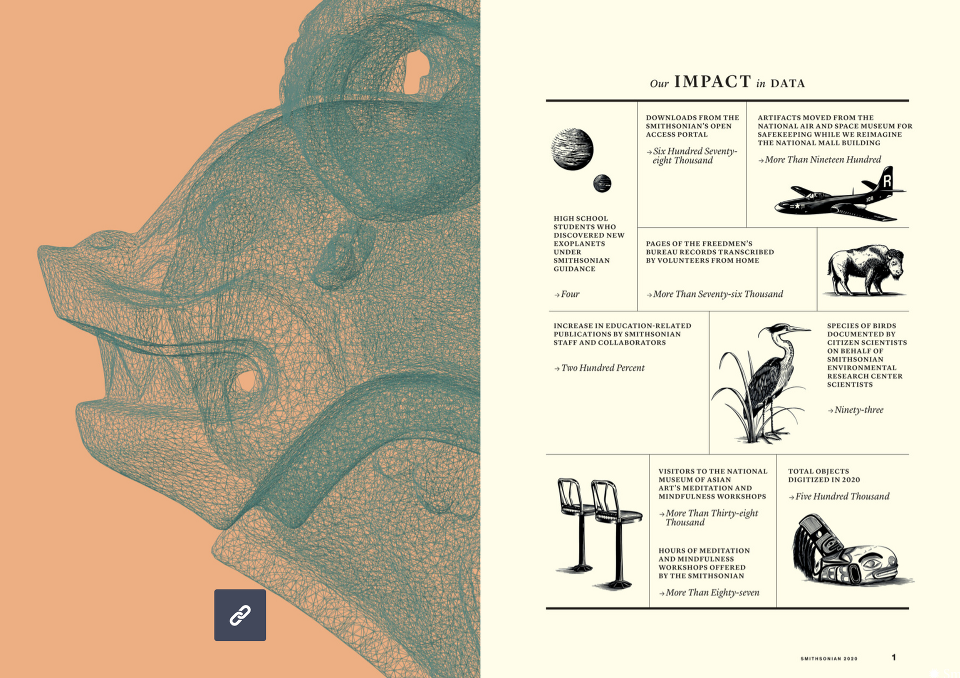 Unsurprisingly, the Smithsonian’s 2020 Annual Report is as visually stunning as it is informative. Each page takes advantage of the full page, with a smattering of art interwoven with copy and storytelling. The result is a beautiful and curated annual report that almost feels editorial.