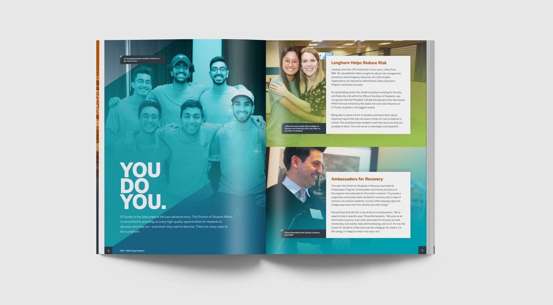 In close collaboration with the 37 units and nine departments that constitute the Division, Mighty Citizen researched, wrote, and designed the Impact Report—weaving in the new visual designs from the “Living the Longhorn Life” brand while also nudging it toward a more dynamic aesthetic. The result is a visually pleasing report with a refreshed identity that connects the reader with the department’s work on campus.