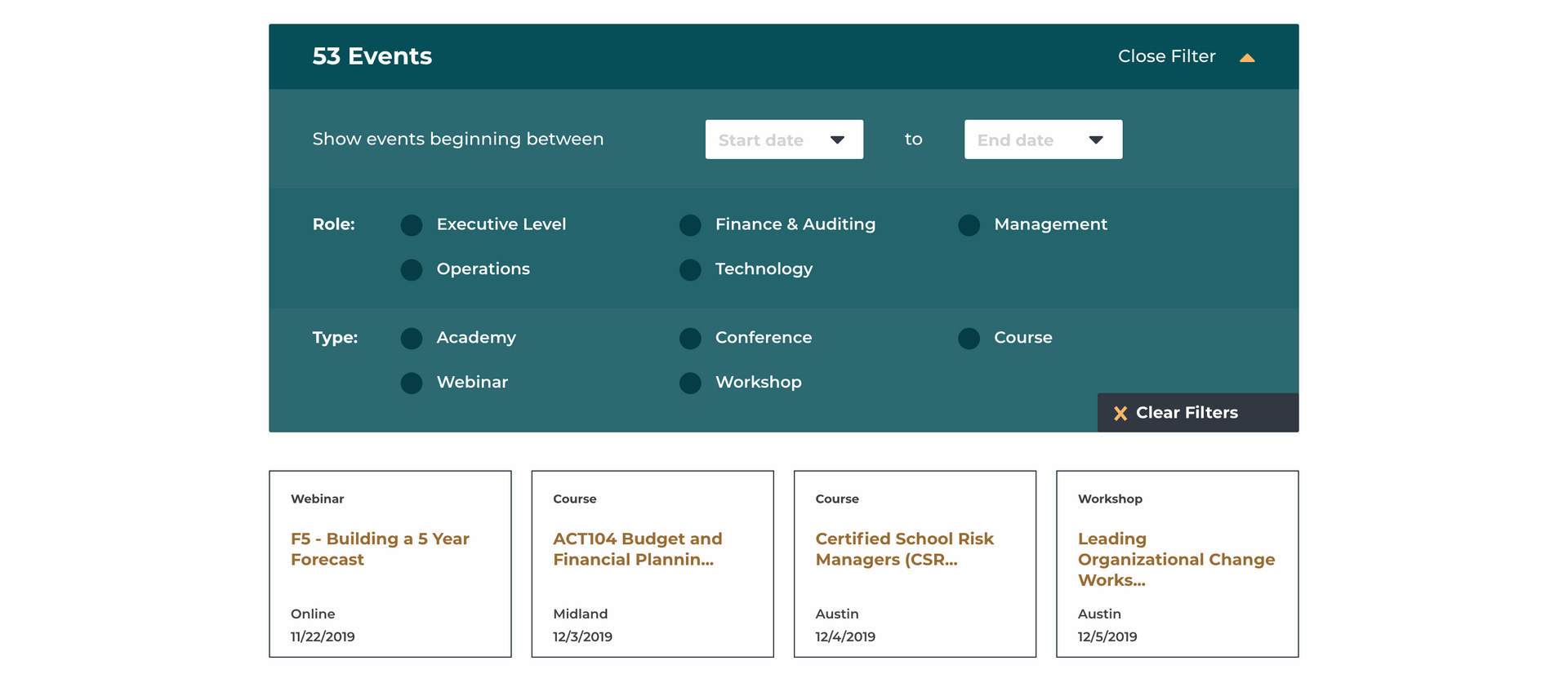 The new TASBO website is a refreshing experience for members and non-members alike. We were able to consolidate an abundance of content into an intuitive website, better sharing the TASBO story. Important training and educational content isn’t buried, and single sign-on works across platforms to integrate the various learning opportunities that bring value to existing and potential members. We also added an events filtering system after learning that one of the primary uses of the website is to search for and register for educational opportunities.