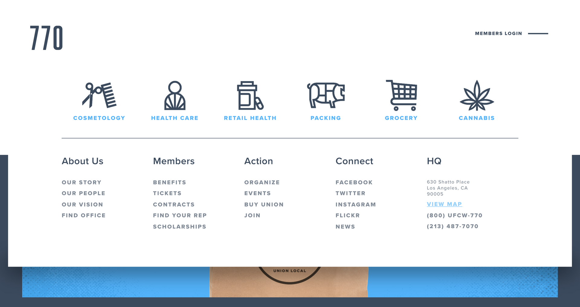 UFCW770 is California’s union local that, this year, both kicked off and won a campaign that secured the most significant wage and benefit increase in 30 years for union grocery workers in Southern California. If you think that’s impressive, check out their website. Not unlike fashion and music, there are trends when it comes to website design. There are tried and true elements that are visually appealing, characteristics that just work. UFCW770’s website meets the trend, then takes it to a level that feels so intentional and curated that we can only be impressed.