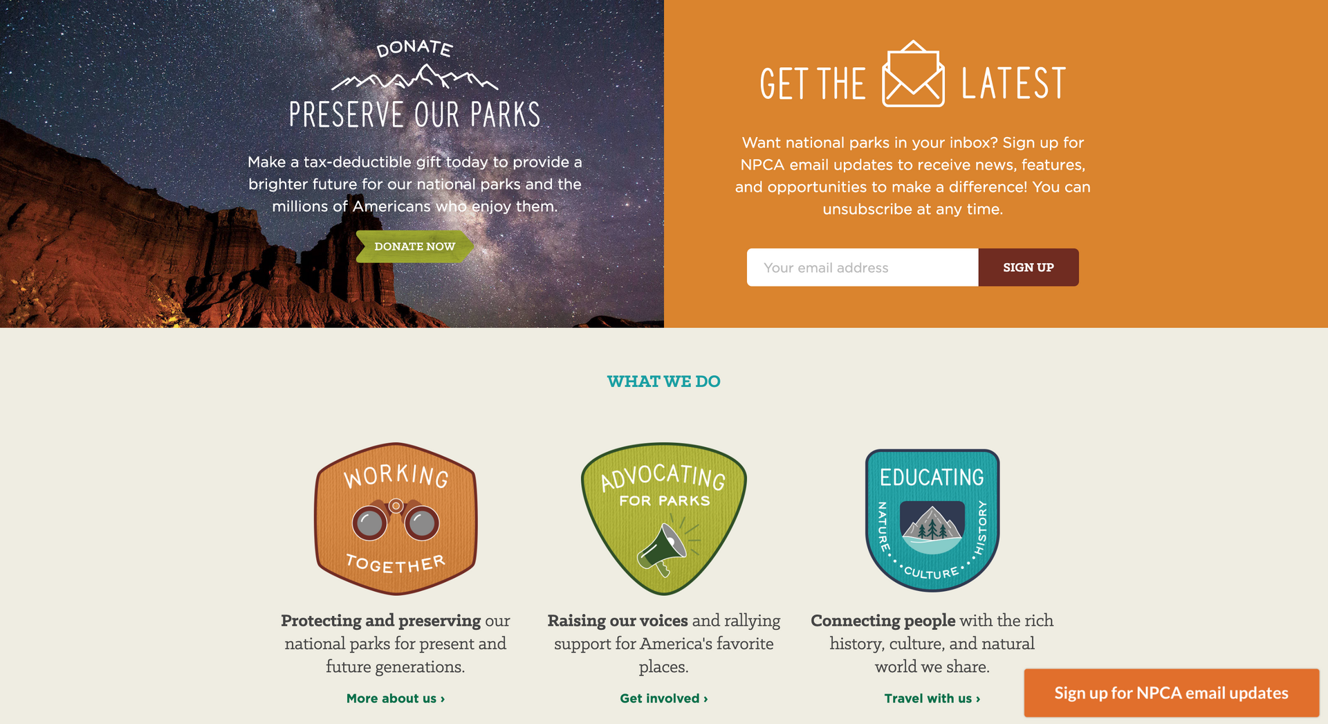 Scrolling down the page, you’ll see NPCA’s mission statement about protecting and enhancing our national parks, clearly sharing why their web visitors should care to get involved with the association. There’s a section that features a specific park (right now it’s Yellowstone) with more links to the insiders’ guide, further bringing visitors into their work. This information primes the user for the next section that includes a newsletter sign-up and another link to donate.