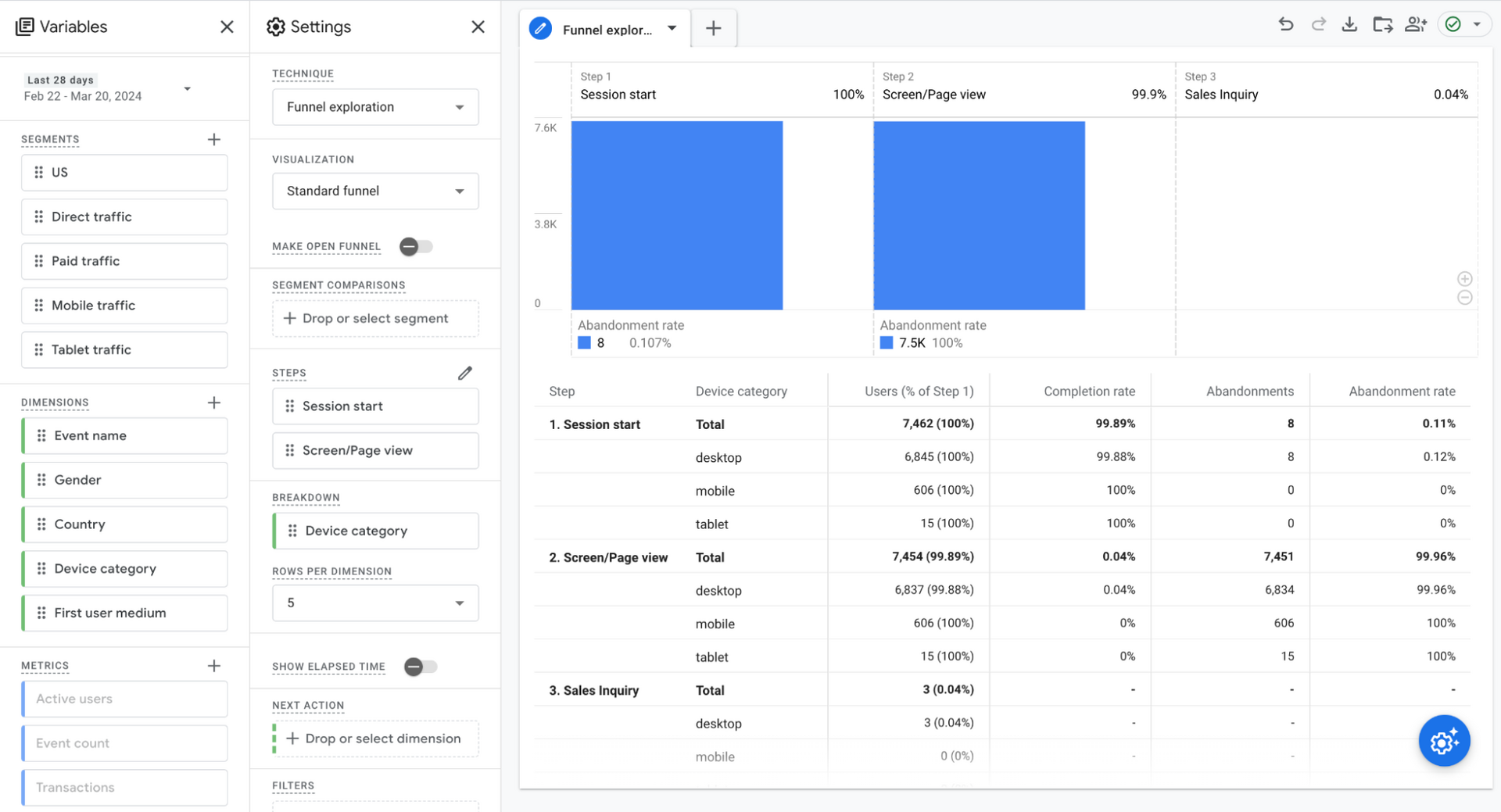 With Funnel Analysis, you can analyze user journeys through a predefined set of steps. This helps you understand conversion rates between steps and where users are dropping off, which is invaluable for optimizing funnels.