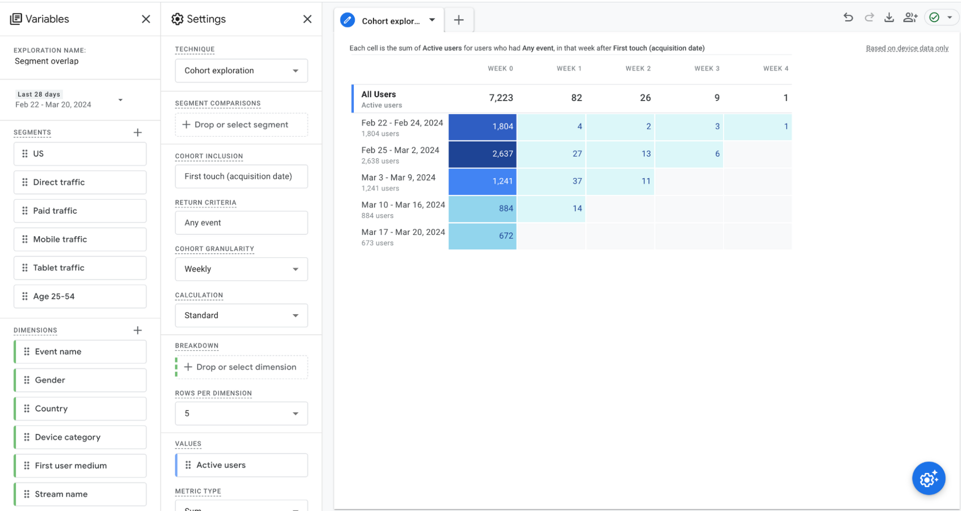 Similar to custom reports in Universal Analytics, the Free Form exploration allows users to drag and drop dimensions and metrics to create custom tables. It’s highly customizable and enables you to dive deep into your data. This is the default exploration technique.