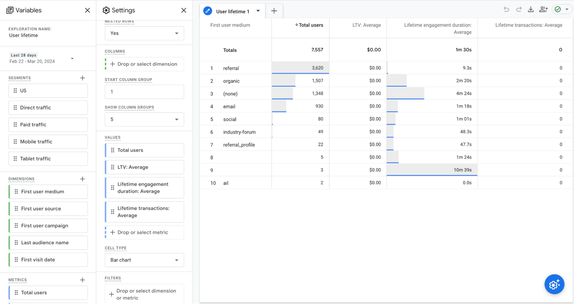 Use case: The Director of Marketing at your association wants to know whether users from organic search add more value in the long term than users who arrive at the site via social media links. Use the Lifetime Value exploration to compare the two traffic mediums and see whether your current marketing spend allocation is optimized for long-term return on investment.