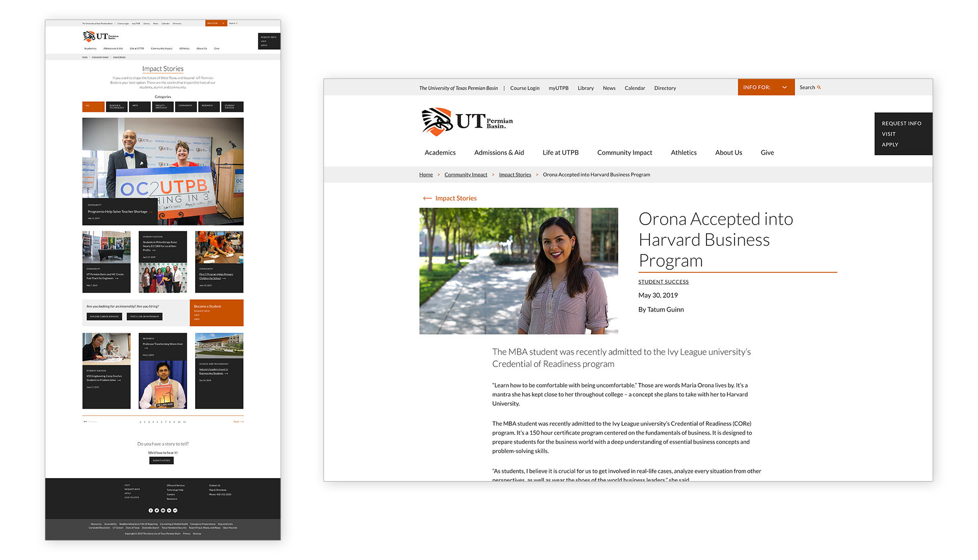 That’s all changed now. Now, the moment a user lands on the new UTPB website, they immediately see and read about how specific, recently graduated Falcons are jumping to the head of the pack in their careers.